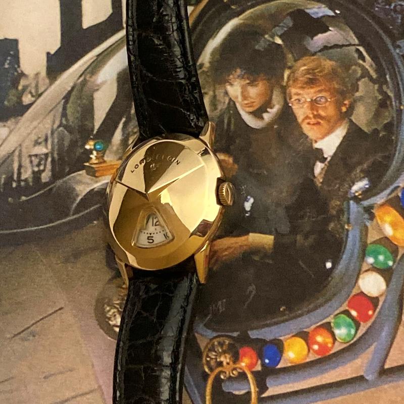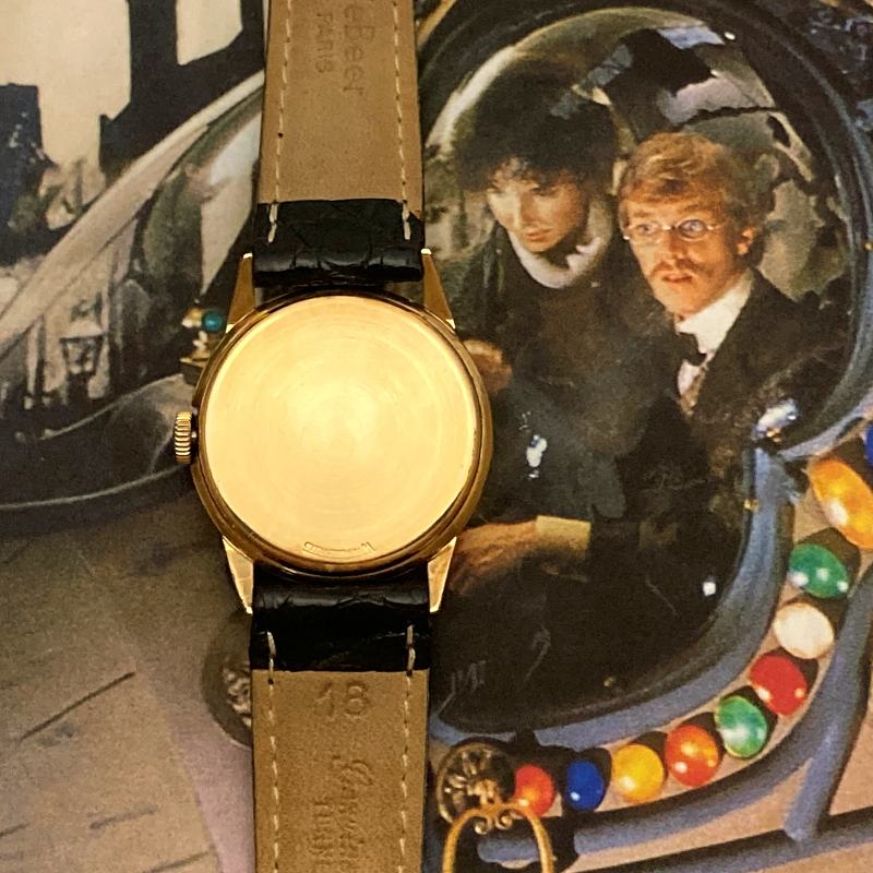 The yellow gold filled case measures 32 mm in diameter (not including the crown) by 9 mm thick. The surface of the watch has a smooth finish that is very reminiscent of "Space Age" styling of the late 1950's. It is a delight to wear and display on your wrist, and your friends will be wanting to get a closer look at how it functions.