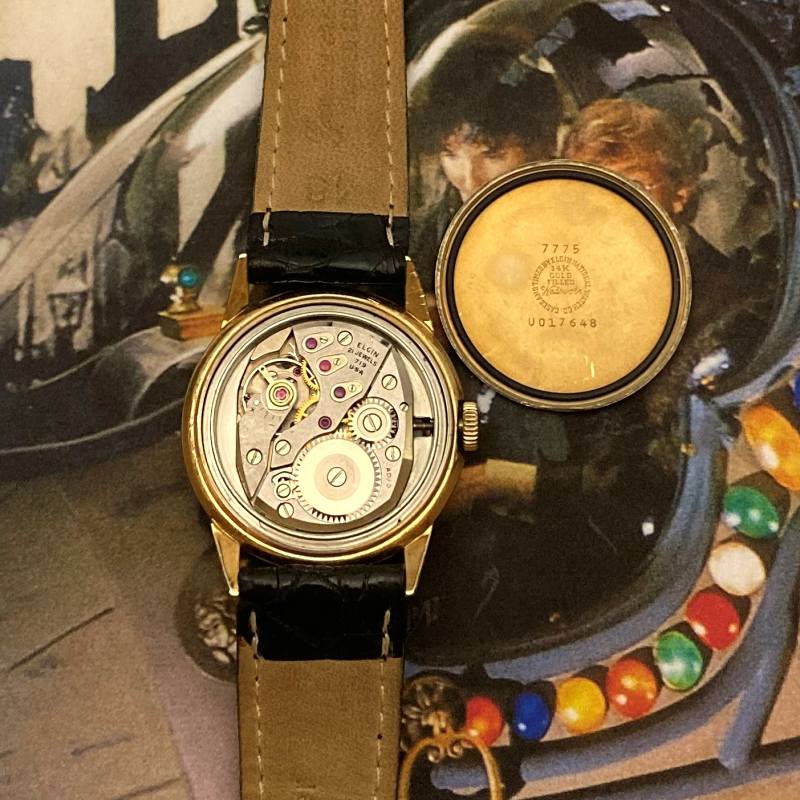 Elgin, the world's largest watch manufacturer, was on the cutting edge of innovative watch design. This was a time of exaggerated fins on automobiles and ducktail hairdos. So, Elgin designers wanted a watch that would take your imagination. They produced a series of what they called "Direct Readers". One was the rectangular shape that later became famous as "The Elvis", one was in a round dimpled case called the "Golf Ball", and this one is the round and smooth version in what you might call a "Chevron" configuration.